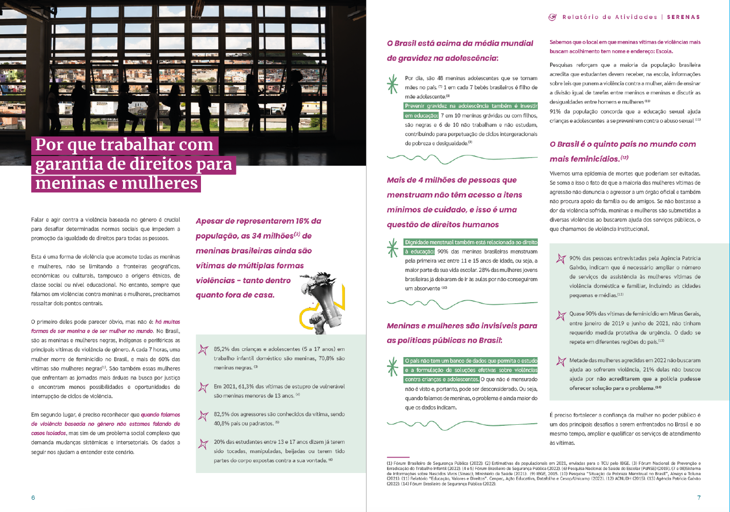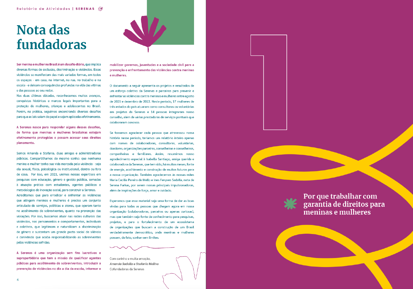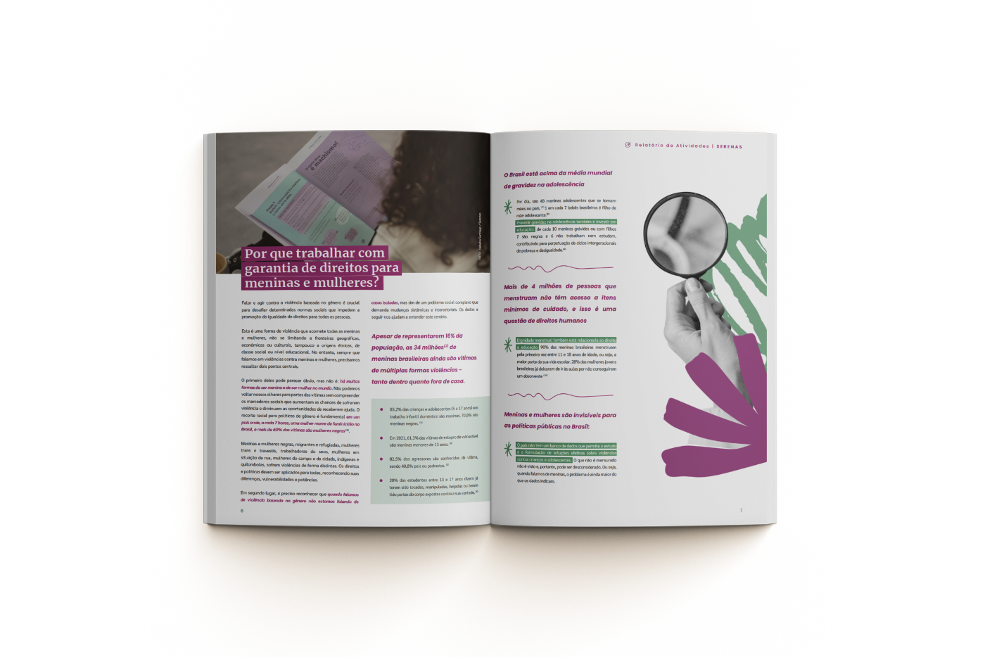 Desenvolvimento do projeto gráfico e diagramação do relatório de atividades da organização Serenas - que atua com os direitos das mulheres e meninas no Brasil.